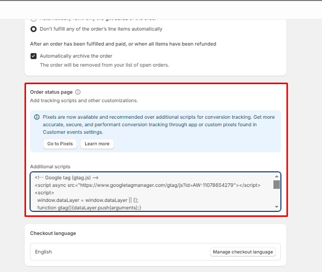 5. Click “Checkout”, scroll down to “Order status page”, and paste the Google Tag code in the “Additional scripts” box