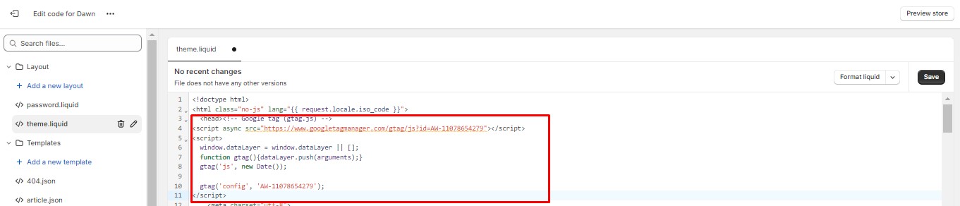 4. Go to the left-hand side menu, click on “Layout” and open theme.liquid file, and then add Google Tag code after the <head> element
