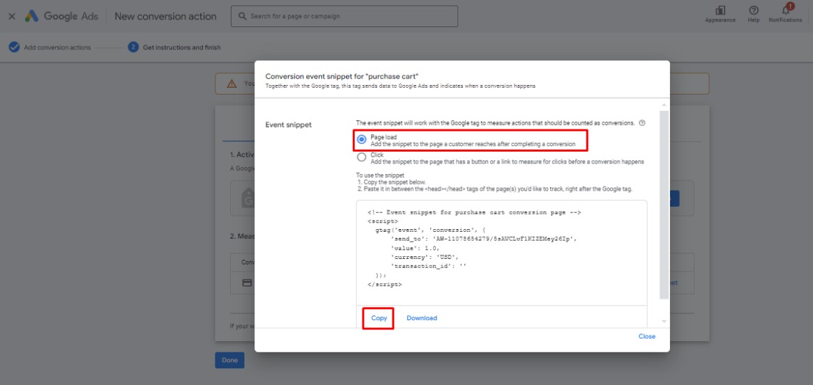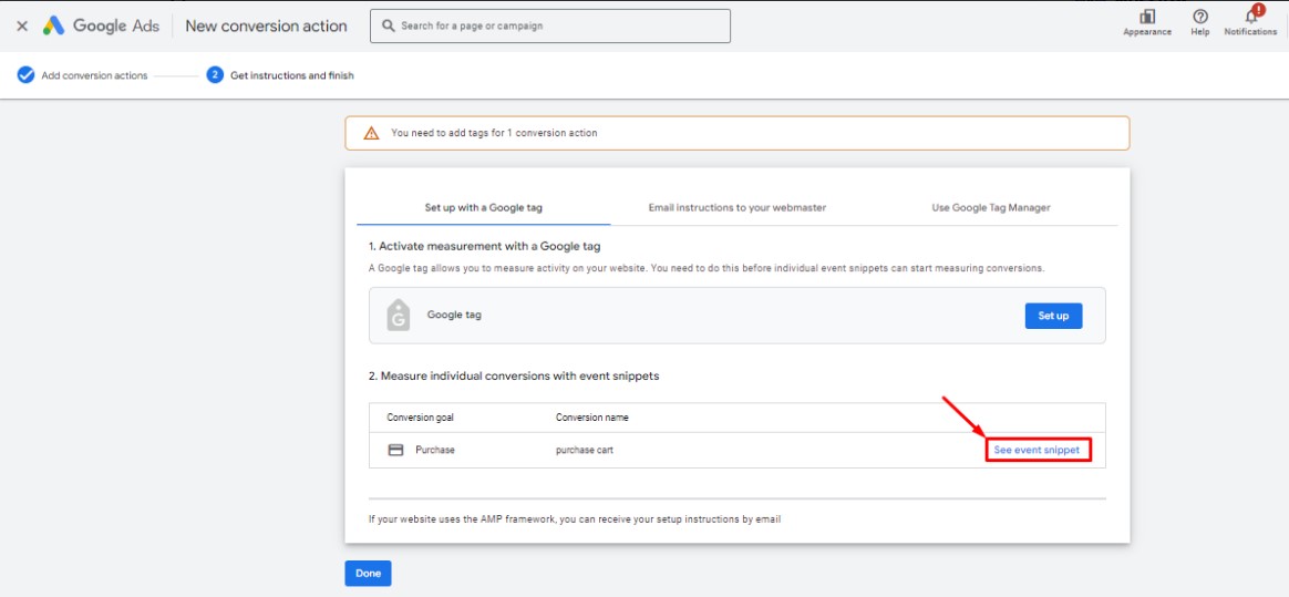 If you successfully finish the first major step, an event snippet for the conversion action should be available.