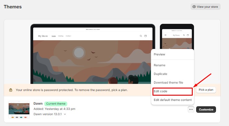 3. Click on “Online Store” then “Themes”, and then “Edit code”