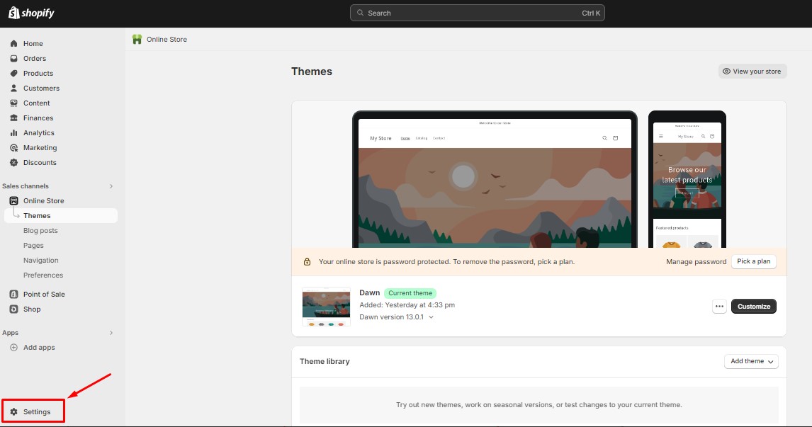 4. Go to the Shopify admin page, and click on “Settings”