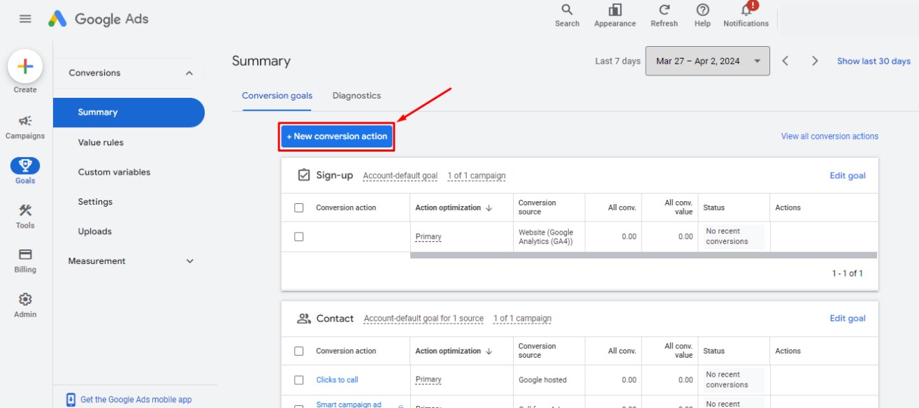 3. Press “New conversion action” at the top of the page