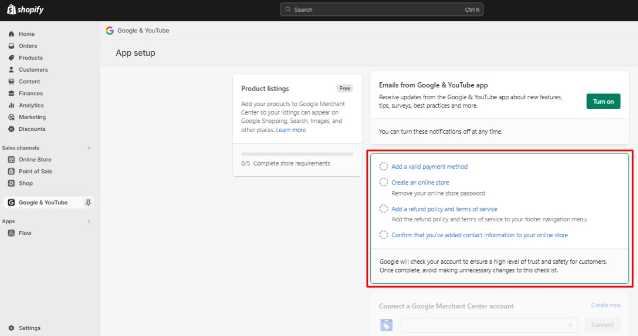 Then you need to check if you are qualifying for the Shopify requirements to use Google and YouTube channel. After you satisfy these two conditions, you can start with the process. Here are the steps you need to take: