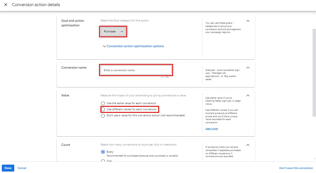 8. Click “Done” to save your conversion action