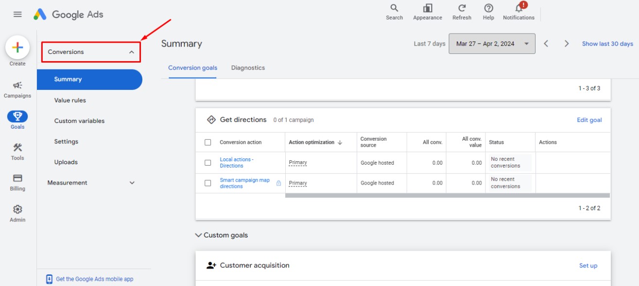 2. Click on “Goals” and then “Conversions”