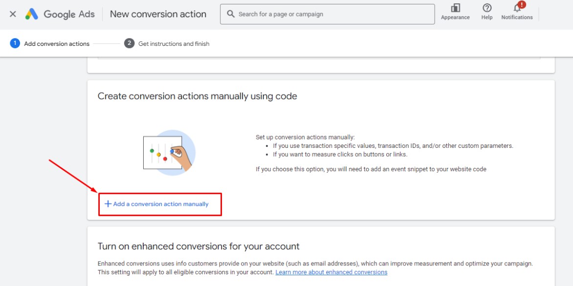 6. Scroll down until you see “Create conversion actions manually using code” and then click on “Add a conversion action manually”